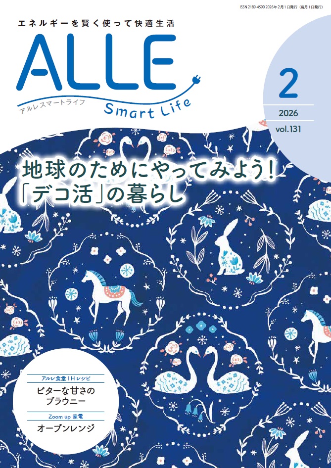 ALLE Smart Life 2月号 特 集 地球のためにやってみよう! 「デコ活」の暮らし 日本は2050年までに、地球温暖化の原因となる二酸化炭素 (CO2)などの温室効果ガスの排出量を実質ゼロにする 「脱炭素社会の実現」を目指しています。 美しい地球を未来へつなぐために、私たちの暮らしの中で 環境に配慮した行動が求められています。 今回は、環境省が推進する「脱炭素につながる新しい豊かな 暮らしを創る国民運動」(愛称:デコ活)を紹介しながら、 私たちにできる ・・続き シリーズ Smart Life Report Zoom up 家電 アルレ食堂 IHレシピ 日本遺産の旅 詳しくは こちら